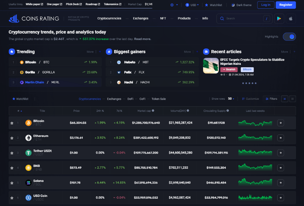 Coins-rating.com is a website that serves as a top crypto stats and comparing web portal, offering a range of services related to the cryptocurrency market. The website provides reliable information about various crypto projects and tokens through a combination of data, news, analysis, and expert verification. It aims to make the crypto world accessible and discoverable for everyone by offering information in multiple languages.