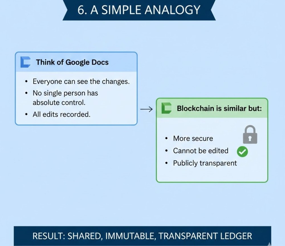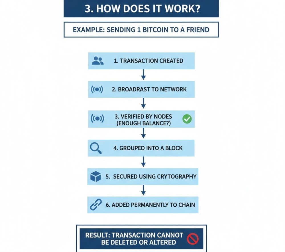 Blockchain is a distributed digital ledger that records transactions permanently, transparently, and in a way that is extremely difficult to alter without relying on intermediaries like banks.