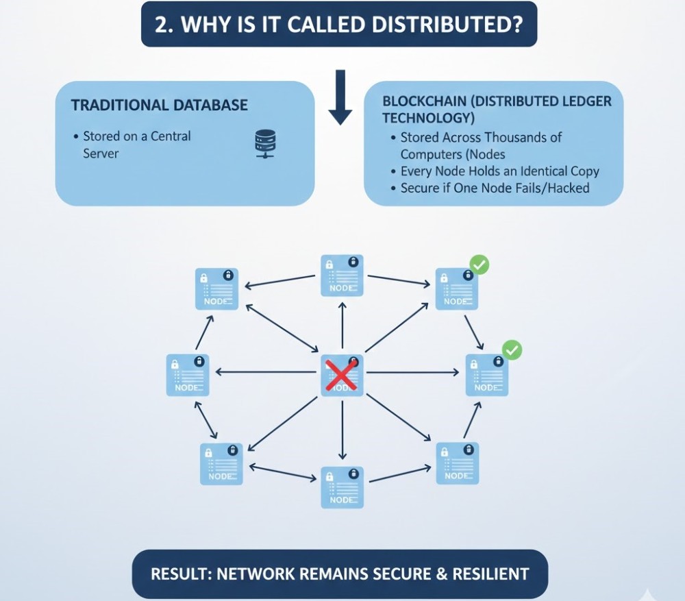 - Blockchain is stored across thousands of computers (nodes) worldwide.