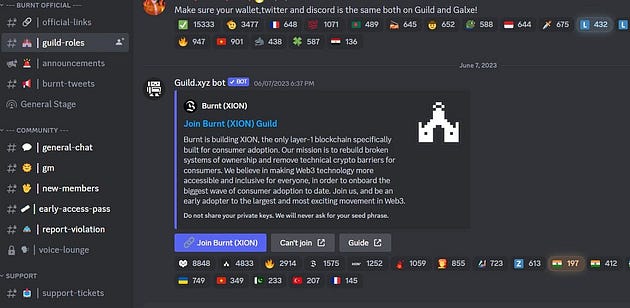 👉 Step 4. Once you claim the above OATs on Galxe, now go to Discord and Claim your Guild role from the channel #guild-roles and then click on Join Burnt (XION).