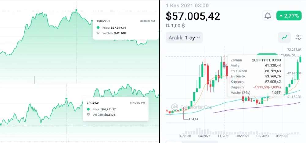 Gece yarısına doğru Bitcoin fiyatı 68800$ seviyesine çıkarak tüm zamanların rekorunu kırmış oldu. Böylece herhangi bir zamanda Bitcoin satın alan hiçbir yatırımcı zarar etmemiş oldu. Son zirvede bu yana 700 bin adet Bitcoin daha dolaşıma sürüldüğü için toplam pazar değeri 1.33 trilyon dolara ulaştı.