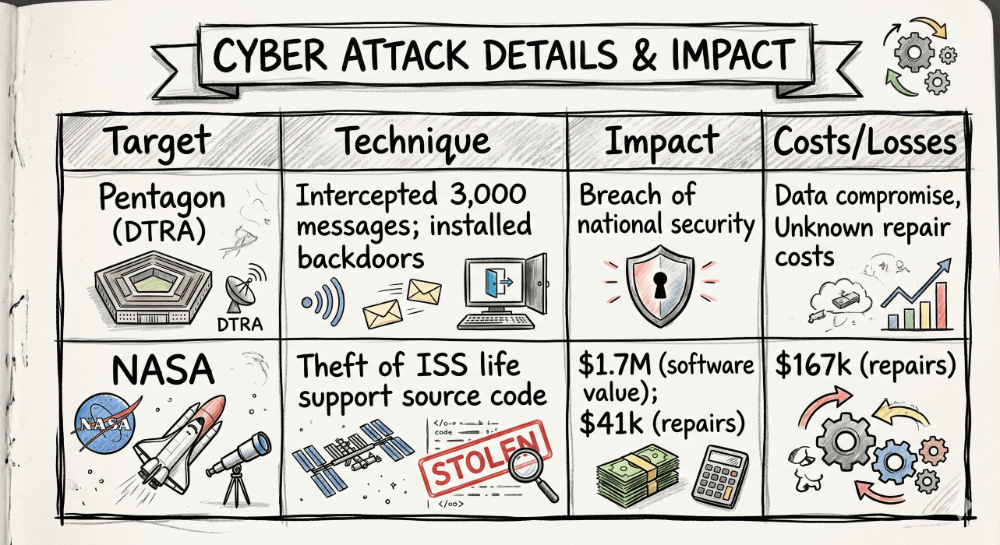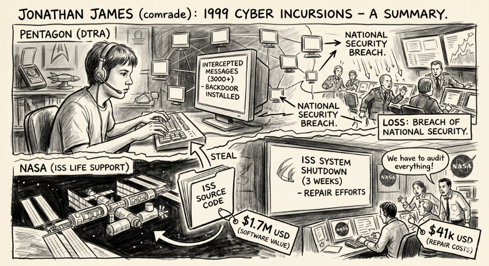 - Pentagon (DTRA): James hacked into the servers of the Defense Threat Reduction Agency. He installed a "sniffer"—software designed to intercept data packets—allowing him to monitor employee communications in real time. He intercepted over 3,000 messages and obtained login credentials for 19 military computers.