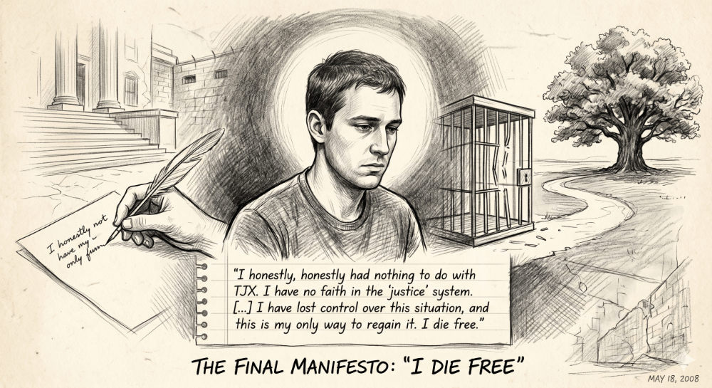 "I honestly, honestly had nothing to do with TJX. I have no faith in the 'justice' system. [...] I have lost control over this situation, and this is my only way to regain it. I die free."