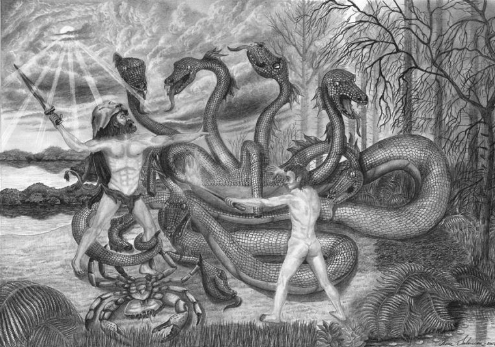 The Hydra, offspring of Typhon and Echidna, was a serpent with nine heads, regenerating two for every one cut off. With the help of his nephew Iolaus, Heracles defeated the Hydra by searing the neck stumps after cutting off each head.