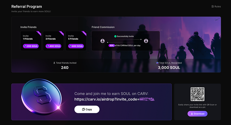 Invite friends to the $SOUL Drop Campaign and earn extra rewards! An invitee minting a CARV ID would be considered a successful invitation. For each friend you invited successfully, you’ll get a 10% commission bonus from their daily $SOUL mining.