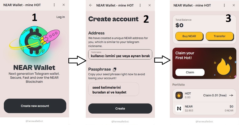 Öncelikle aşağıdaki linkten telegrama bağlanıp cüzdan kurulumuna geçiyoruz. 1. görselde olduğu gibi "Create new account" diyerek kuruluma geçiyoruz. 2. görseldeki seed kelimelerini kayıt ediyoruz ve en önemlisi istediğimiz bir nickname belirliyoruz. Nickname.tg sizin cüzdan adresiniz olacaktır.