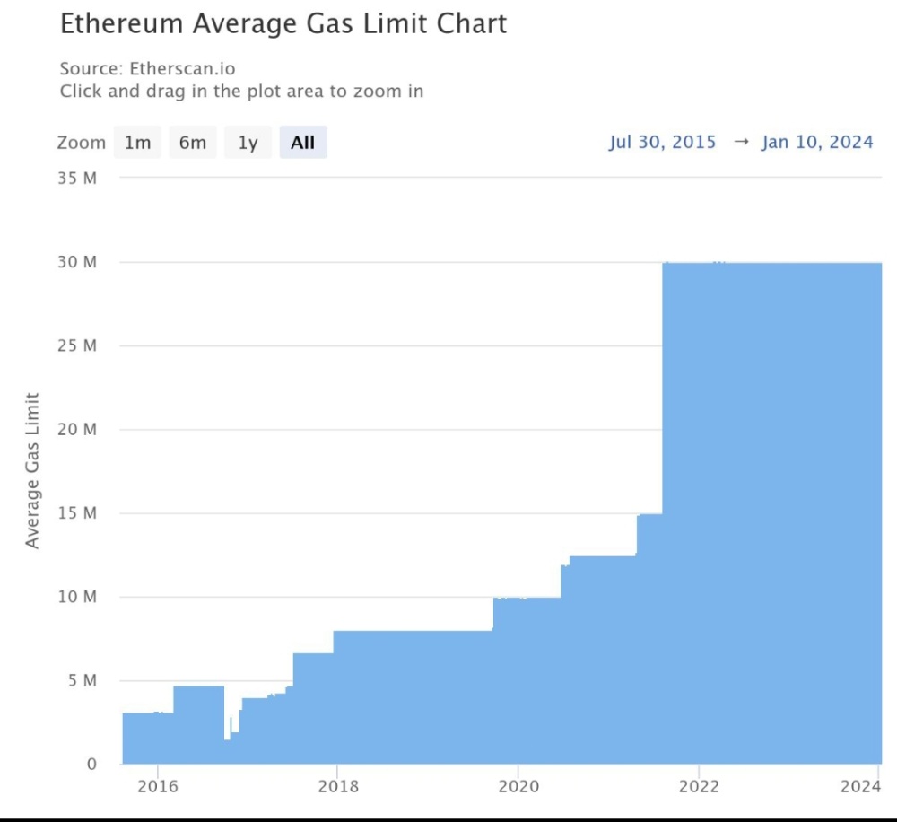 Buterin also made some quick estimates, estimating an increase to around 40 million. According to Etherscan, the current gas limit is 30 million, so Buterin proposes a 33% rise.Following Ethereum's beginning in 2015, the average gas limit was around three billion, which has risen over time with network utilization and adoption.