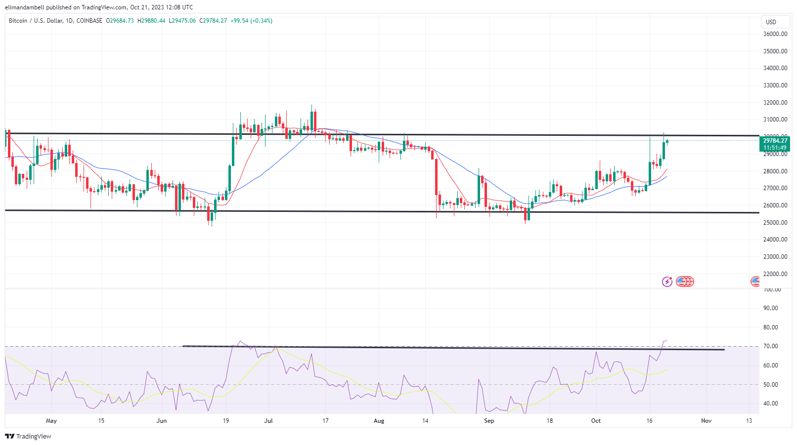. Bitcoin traded around the $30,000 region to start the weekend, as markets remained optimistic that an ETF approval could be looming. This has been the topic of the week, with many speculating how high crypto markets could surge on such potential news. Ethereum slipped from Friday’s peak.