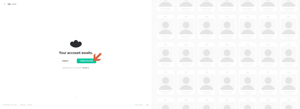 Go to https://onboarding.lens.xyz/ and click Create Account.