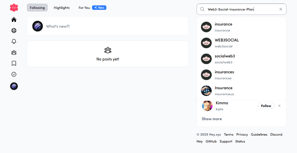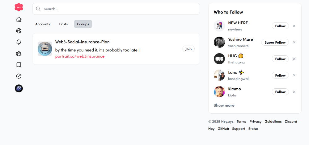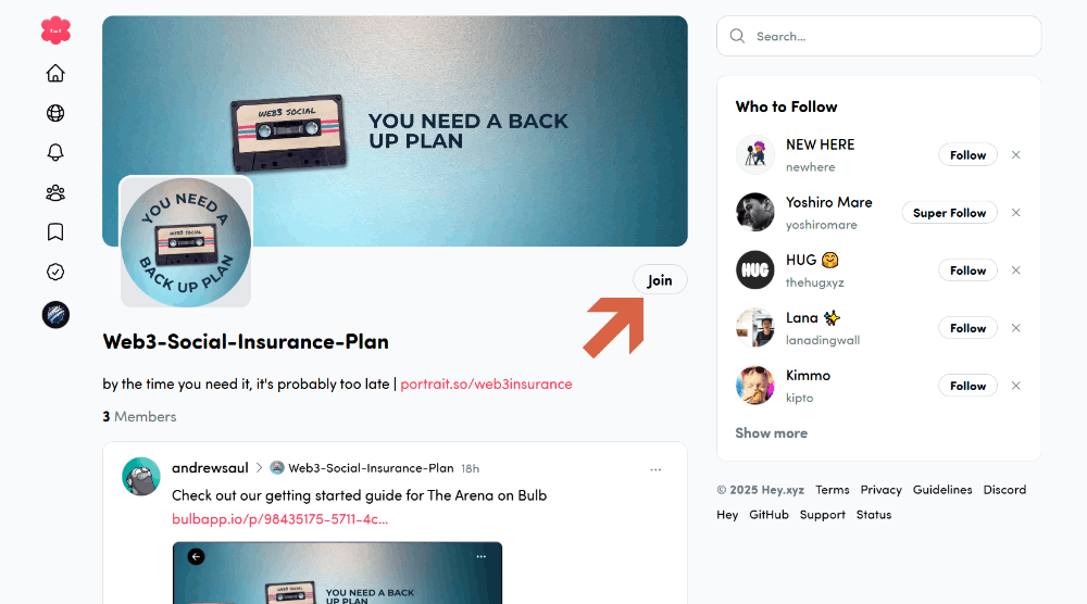 On Hey you'll need to do a general search for "Web3-Social-Insurance-Plan" and click on the Groups results. You can find our group from there.