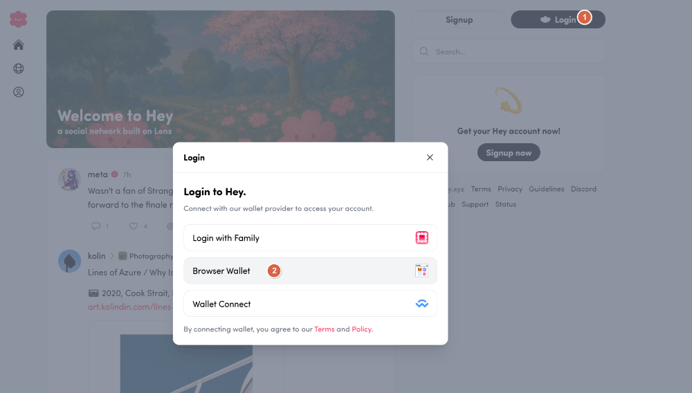 Login in (1) with the wallet you created your Lens profile with (2)https://hey.xyz/