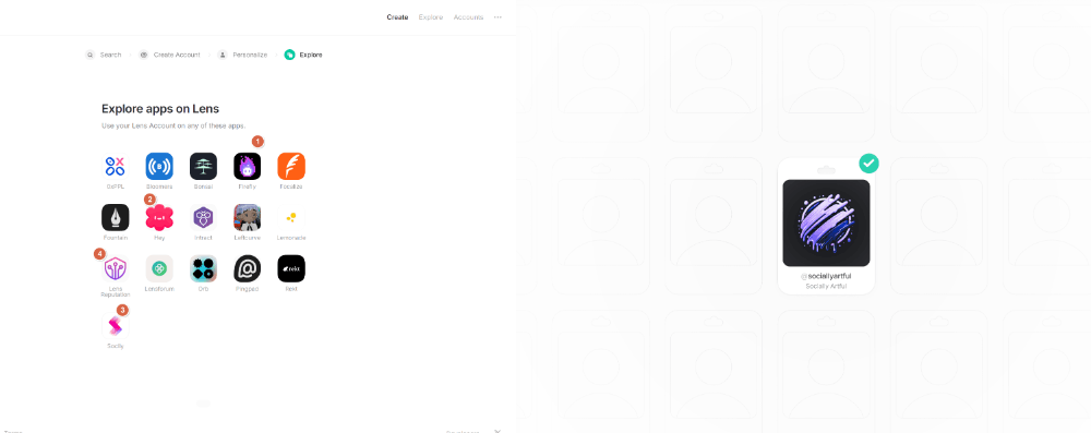 The first thing you need to do is create a Lens profile. This will be your core account on Lens and you can use it to log into any Lens app and access all your posts, friends, groups etc... If you don't like an app, it's so easy to move from app to app because you own all your data, apps just access it from the Lens base layer for you (as it should be).