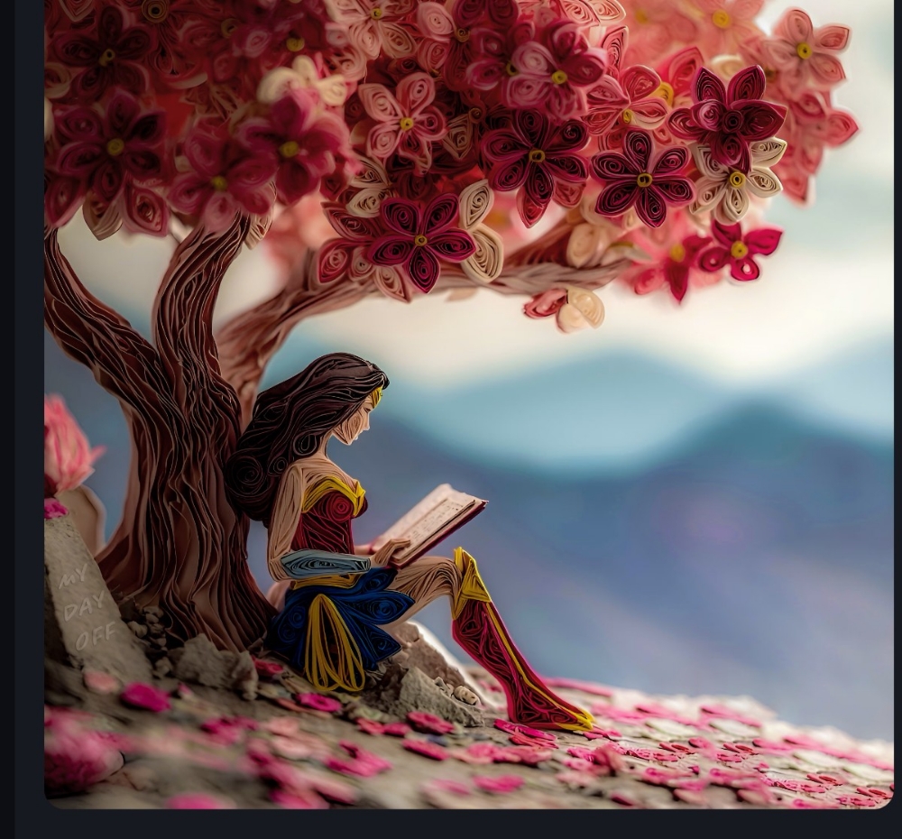 This artwork by Paul Charles is so beautiful and full of detail. The mix of soft pink flowers with the bold blue background creates a striking contrast that makes everything feel lively. I especially love how the layered paper flowers and the curled, swirling shapes add so much texture, like you can almost feel the petals and petals layered together. The way the lines flow around the figure and the flowers gives the whole piece a sense of movement, as if the scene is in motion and not just frozen. The darker shading helps ground the brighter colors, so the composition looks balanced even though there is a lot happening. The highlights and shadows also bring depth and make the details stand out more. Overall, it feels emotional, creative, and thoughtfully designed, and it really holds your attention from beginning to end.