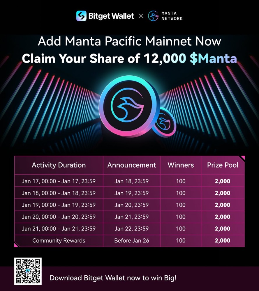 This offer is only for new users who haven't used Bitget Wallet before January 17th. To participate, hold at least 10 USDT on the Manta Pacific mainnet. 100 lucky participants will receive 20 $MANTA each daily. Join the AMA on January 22nd for registration details.