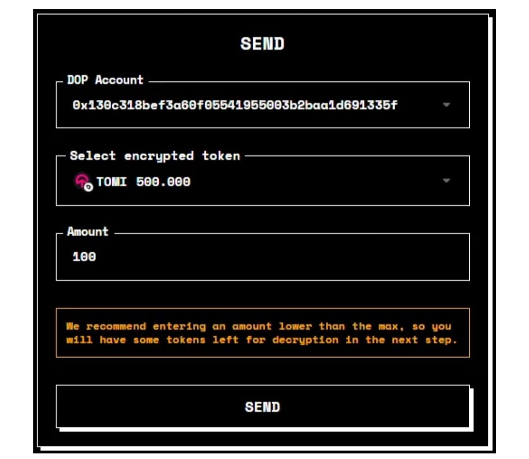 In the Step 6 — Send Assets tile, click on Get Started to go to the Send screen. Then follow the steps below to send encrypted assets to another DOP wallet.