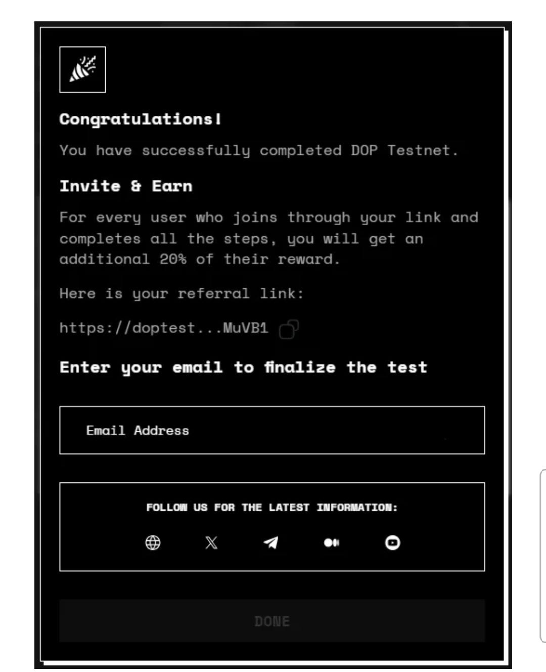 A popup appears to let you know you have successfully completed DOP Testnet. The dialog box also includes your unique referral link, which you can use to invite friends to the testnet. For every person that you invite wh will complete all the testnet steps you will earn 20% of their reward, in addition to the reward you will receive yourself for having completed the testnet.