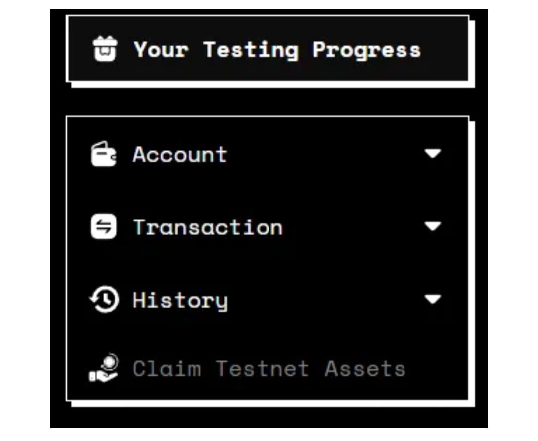 The menu bar on the upper left side includes all the functions available on the Testnet. Click on any menu item to expand it and reveal the available functions. You can always click on Your Testing Progress to return to the testing dashboard.