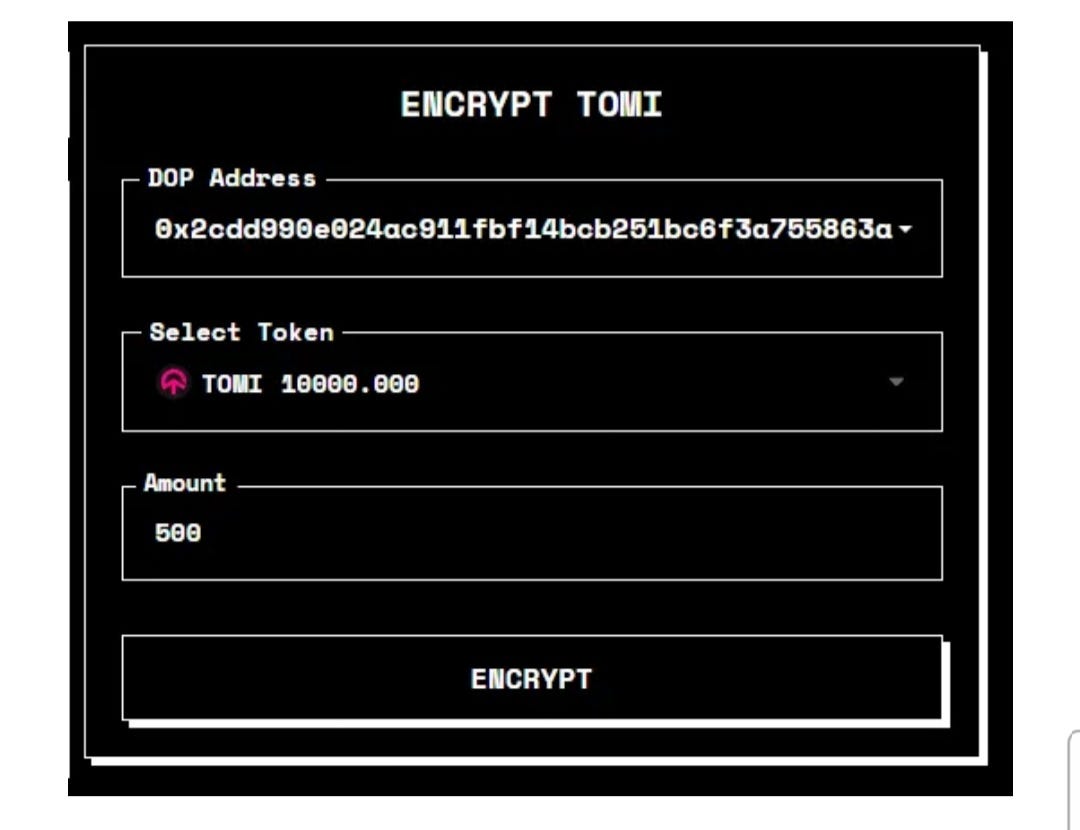 On the Encrypt screen, the DOP Address field is pre-populated with your DOP wallet address. If you have created more than one DOP account, you can click the down arrow on the right to open the dropdown and select the account you want.
