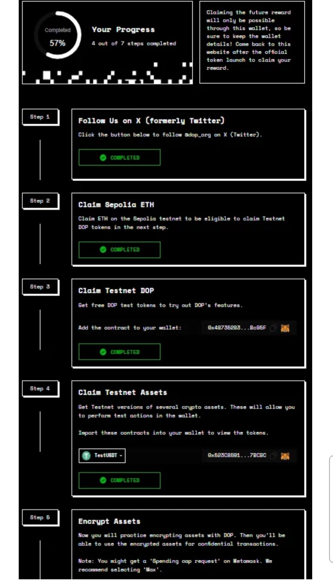You need to complete 7 steps in total to be eligible for DOP rewards. The steps are listed below the progress section. Once you complete each step, its status will change to Completed, and the next step will become available.
