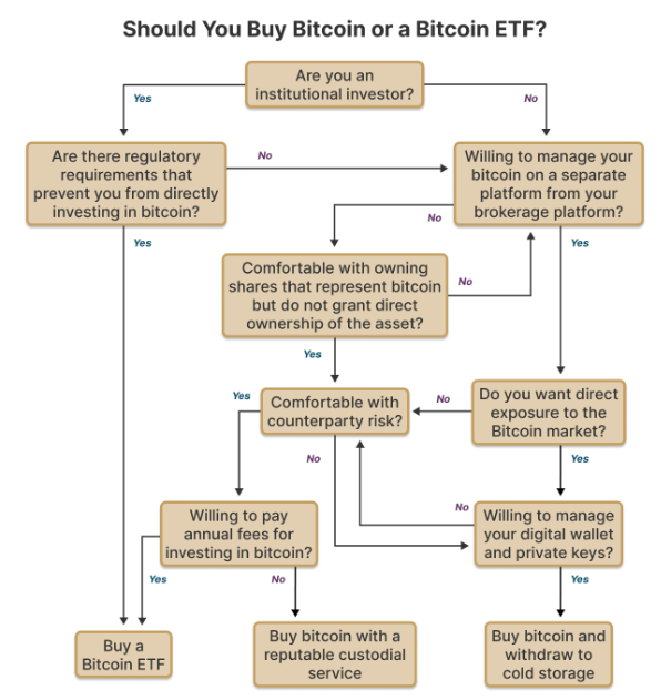 - Do you want to use bitcoin or purely invest? ETF leans to investment only. Self custody unlocks usage or trading.