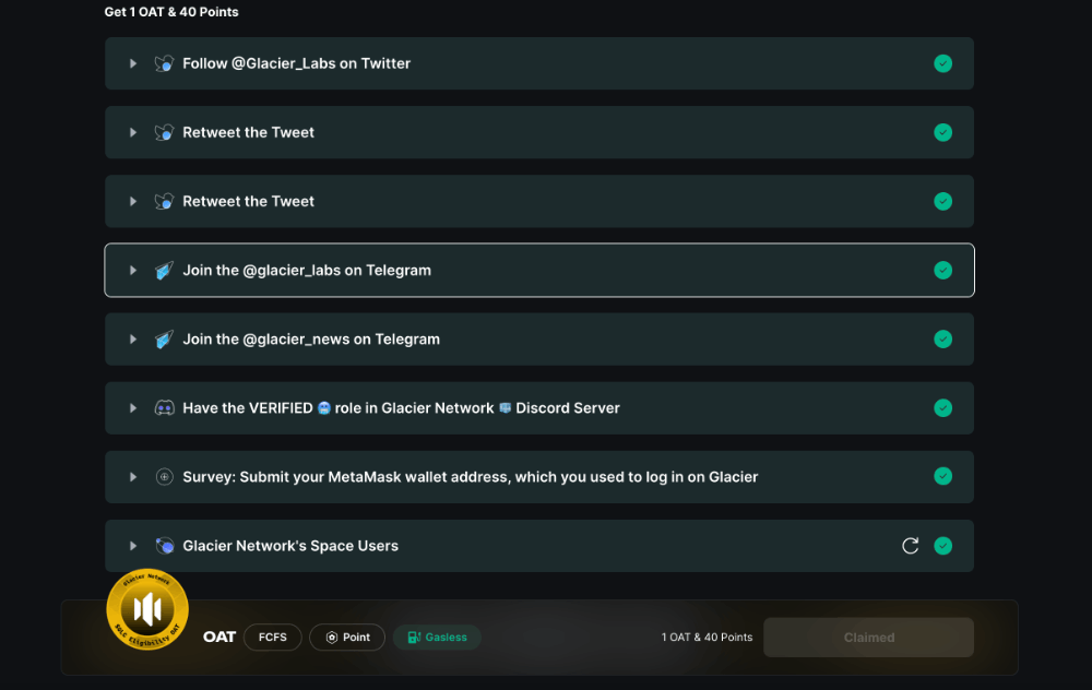 Görüleceği üzere neredeyse hepsi sosyal medya görevi son iki görevi belki daha önce galxe görevi yapmayan arkadaşlar için açıklayabilrim. En sonra sırada yer alan görevde galxe üzerinde Glacier Nerwork ü takip etmemizi istiyor, site üzerinden aratıp bulabilirsiniz. Onun bir üstünde Glacier sitesine gaxle ile girdiğiniz metamask cüzdanız ile girmeniz gerekiyor.