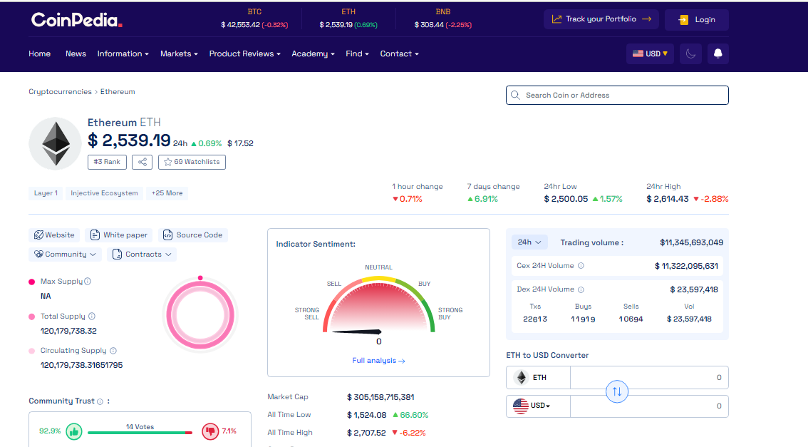 The current price of Ethereum is $2,539.19, with a 24-hour volume of $11,345,693,049. The Ethereum token’s total circulating supply is 120,179,738.31651795 ETH.