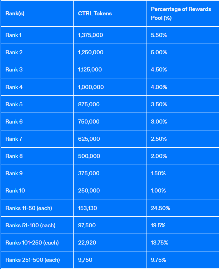 150,000,000 CTRL tokens representing 0.15% of the total token supply. All rewards will be distributed on March 14, 2024.