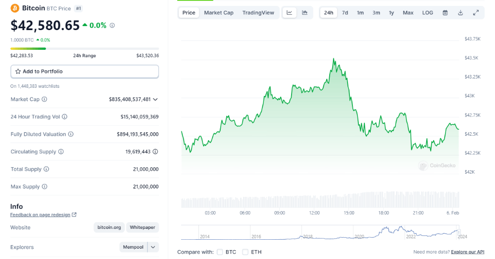 Sandor, K. (2024, February 5). Bitcoin Slips Towards $42K as Interest Rates Soar; Chainlink’s LINK Defies Crypto Slump. Retrieved from https://www.coindesk.com/markets/2024/02/05/bitcoin-slips-towards-42k-as-interest-rates-soar-chainlinks-link-defies-crypto-slump/