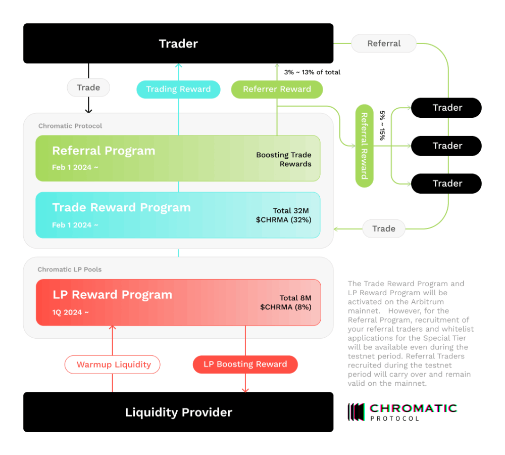To incentivize and reward early supporters, Chromatic Protocol has launched an Airdrop Program. The program is designed to assess and reward community activities and contributions during the Testnet (Arbitrum Goerli) period and the initial phase of the Mainnet (Arbitrum One), which spans from November 2023 to sometime in the first quarter of 2024(1 3).
