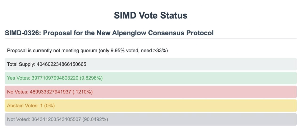 Voting has started on Solana for SIMD-0326 Alpenglow, a proposal to cut block times from 12.8 seconds to 150 ms by upgrading the consensus protocol.