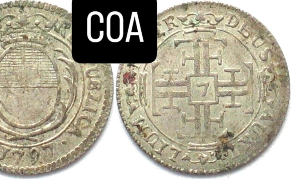 This coin is a 1797 Swiss 1/8 Gulden (7 Kreuzer) from Freiburg. It is made from silver and is noted to be in "UNC" condition, which stands for uncirculated, indicating it has seen little to no wear and retains its original mint luster.