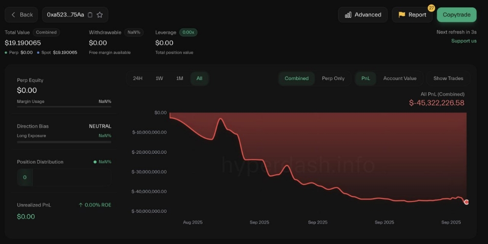 đź”˝Another trader made history on Hyperliquid, not with profits but a record $45.3M loss. Left only $450K behind, a handful compared to what he had. From whale to shrimp in 40 days.