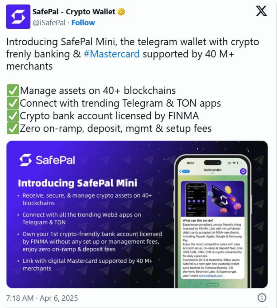SafePal introduced the Mini Wallet on Telegram, featuring a banking gateway and a digital Mastercard. The company also enhanced its hardware wallet security from EAL 5+ to EAL 6+, surpassing typical financial sector standards. The Mini Wallet supports over 40 networks and offers digital payments via Mastercard, PayPal, Apple, Google, and Samsung Pay.